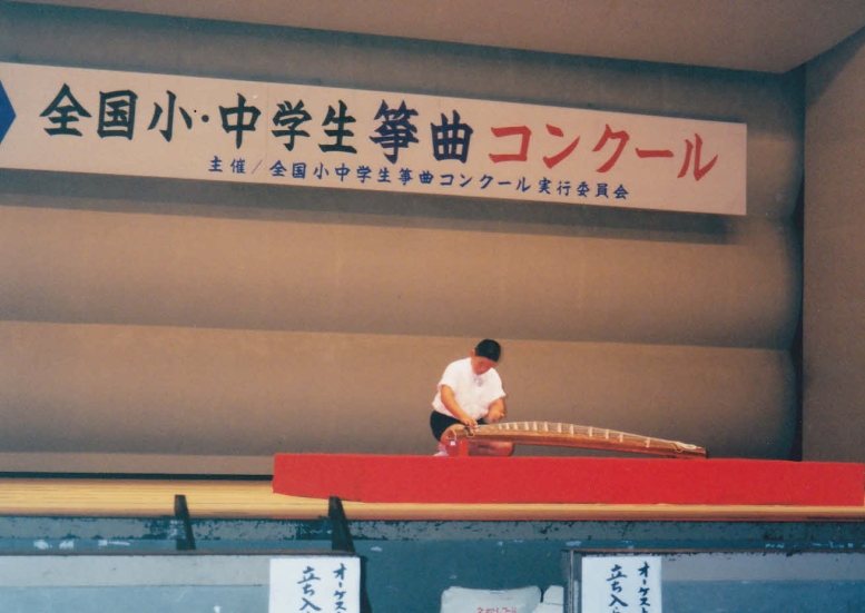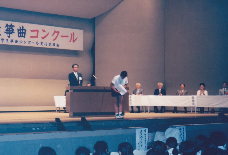 師匠の植木先生が、声変わりする前に歌でコンクールに出場させたいと、小学4年生の時に宮城道雄の“水滴”で挑戦しました。見事 小学生の部で優秀賞を受賞。この年の最優秀賞は同じ4年生で東京芸大2年先輩の橋本みぎわさんでした。審査員の宮城会大師範である砂崎知子先生から「美しい声ですね。水滴は、“ポタリ〜、ポタリ〜”でなく“ポ タ リ、ポ タ リ”ですよ。」と論評を頂きました。その後、福山で開催される全国小中学生コンクールで数々の賞を受賞、中学3年生の時にはコンクール最高位の牧本賞を受賞しました